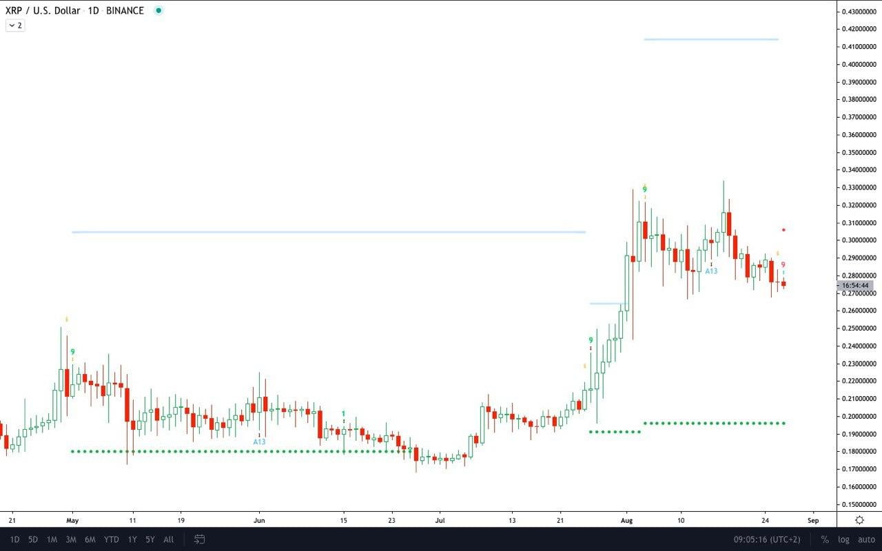 Chart of XRP's price action over the past few months from a Telegram channel tracking the Tom Demark Sequential. Chart from TradingView.com