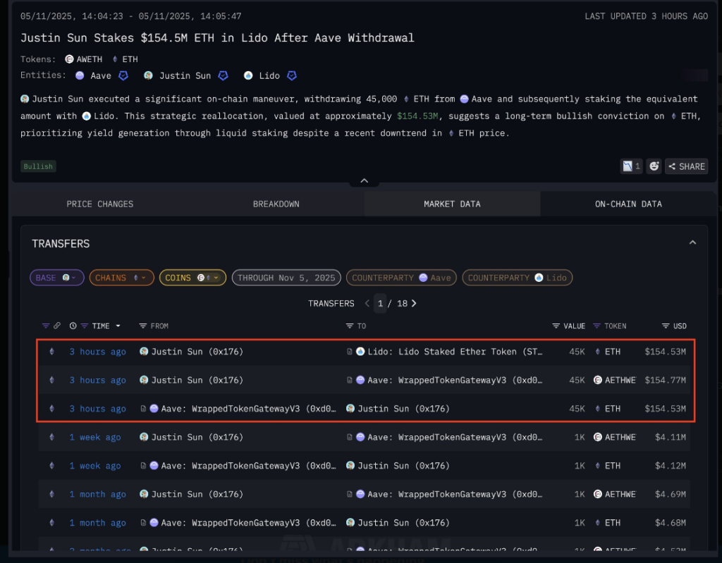 According to on-chain data, about 45,000 ETH — worth roughly $154.5 million at the time — was shifted from the lending protocol Aave into the Lido Finance staking pool.