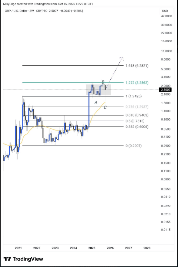 Mikybull pointed to an ABC correction pattern that looks close to finishing. He showed XRP hovering around $2.50 and sitting just above a long-term moving average, a zone that has acted as support in prior cycles.