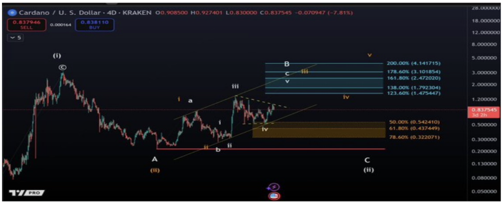 A detailed Elliott Wave structure reveals a series of corrective and impulsive waves, suggesting that Cardano may be in the midst of a potential wave extension toward the $4 price point. The Fibonacci Extension levels on the chart also show targets ranging from $1.47 to $4.14, with the upper range representing the 200% retracement level.