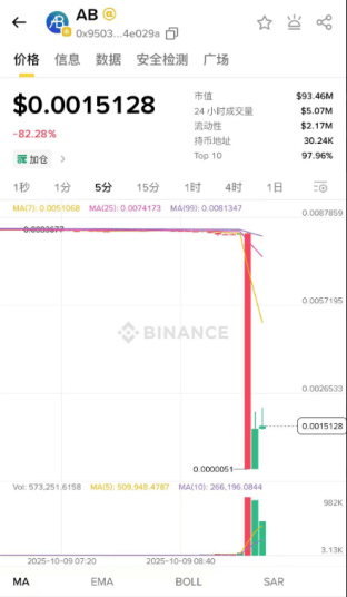 According to Binance market data, the Binance Alpha token AB plunged from $0.0083 to $0.0000051 within two minutes — a drop of about 99% — before rebounding to $0.00151, still down more than 80% on the day. pic.twitter.com/mH8Y98MzES