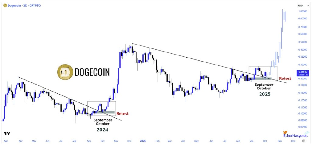 EtherNasyonaL, another crypto analyst, is more aggressive with Dogecoin. According to his projection, Dogecoin has now completed a successful retest after breaking above a descending trendline of lower highs. The most recent 3-day candlestick now shows Dogecoin forming a bullish candle above $0.25, and now the next step is a bullish leg to new all-time highs.
