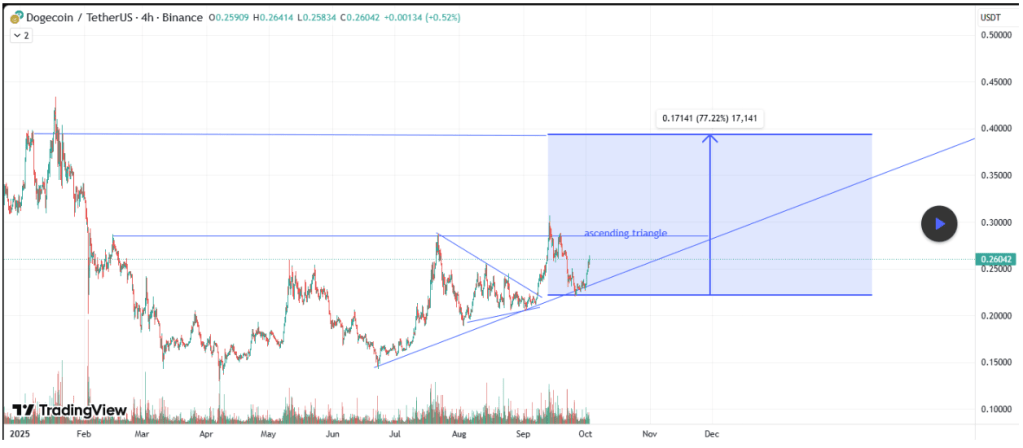Dogecoin has been consolidating in a clear nine-month ascending triangle and is now approaching a key breakout point, according to a TradingView analysis. The pattern has been forming since early 2025 with rising support around $0.22 and a horizontal resistance zone between $0.28 and $0.30.