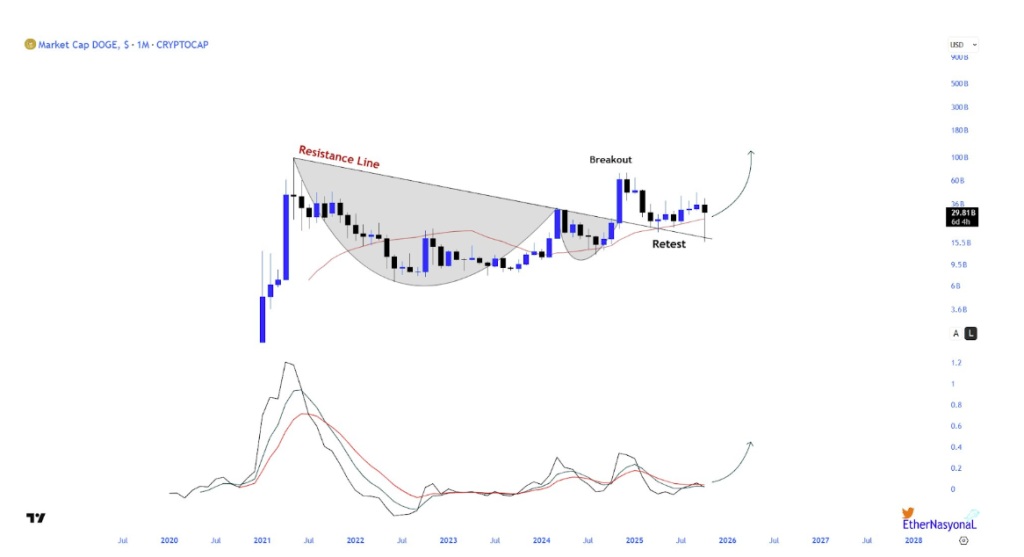 The chart shared by EtherNasyonaL looks at a cup-and-handle structure that has been developing on Dogecoin’s market cap chart for several years. The cup portion stretches across 2022 and 2023, a long and gradual recovery phase following Dogecoin’s blow-off peak in the 2021 bull market.