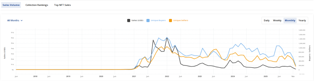 NFT sales fell to $320 million in November, down from close to $630 million in October, CryptoSlam data shows. That level is roughly on par with the $312 million recorded in September 2024.