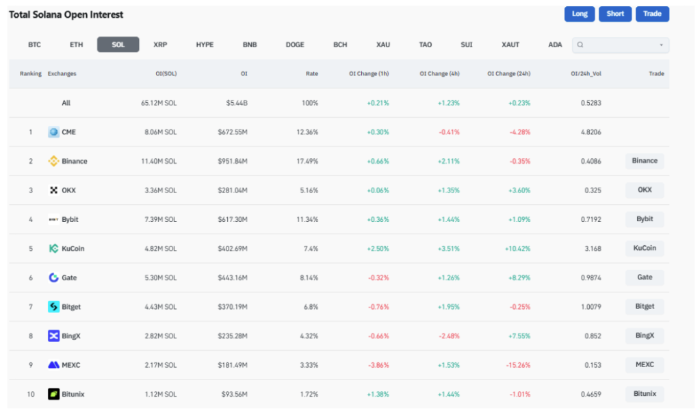 According to data from Coinglass, Solana’s total open interest across all exchanges is currently at $5.44 billion, which is about 65.12 million SOL in outstanding futures contracts. That figure places open interest back within the same range it occupied in April 2025, effectively erasing nearly a full year of buildup in the asset