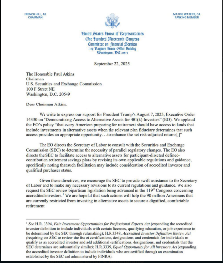 According to letters sent to the Securities and Exchange Commission, nine lawmakers — including House committee chairs French Hill and Ann Wagner — urged SEC Chair Paul Atkins to act on an executive order from US President Donald Trump that would make it easier for retirement plans to hold crypto. The move would touch roughly 90 million Americans who use 401(k) accounts.