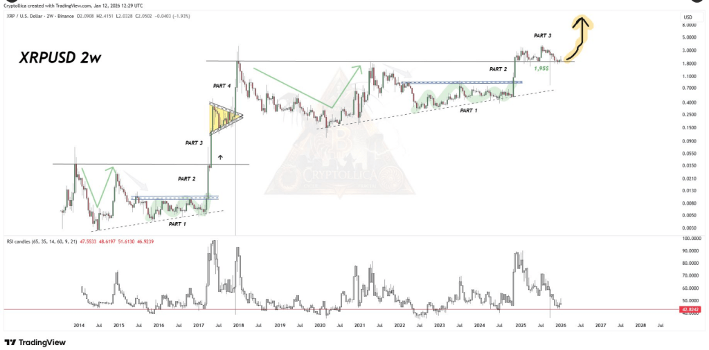 Cryptollica projects that when the cycle moves into Part 4, XRP could run toward $8, which would be roughly a 290% rise from a current price near $2.05. Reports also highlight views from Bird, a developer in the XRP Ledger ecosystem, who has argued that XRP should be considered for long-term savings plans.
