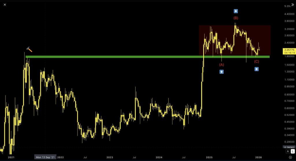 According to reports, the next major hurdle is a multi-month trendline resistance near $2.10. A clean daily close above this line, combined with rising volume, could signal the start of a new uptrend.