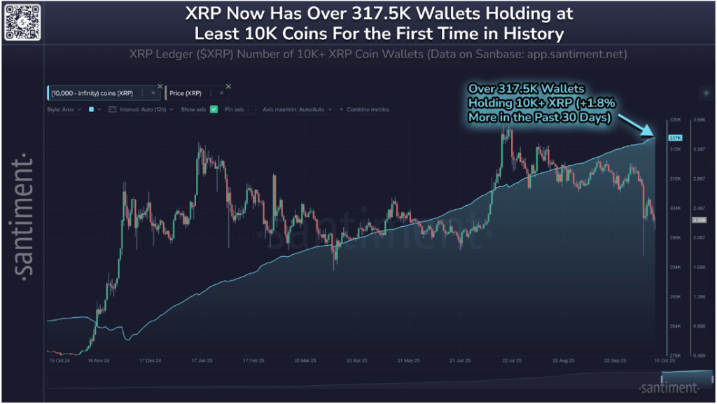 XRP has shown some signs of recovery over the past 48 hours, climbing about 5.3 % from its recent low, according to on-chain analytics platform Santiment. The rebound comes as investor confidence appears to be returning, as it coincides with a steady rise in mid to large-sized XRP holders. Particularly, on-chain data shows that the XRP ecosystem now has more than 317,500 wallets holding at least 10,000 XRP tokens for the first time in its history.