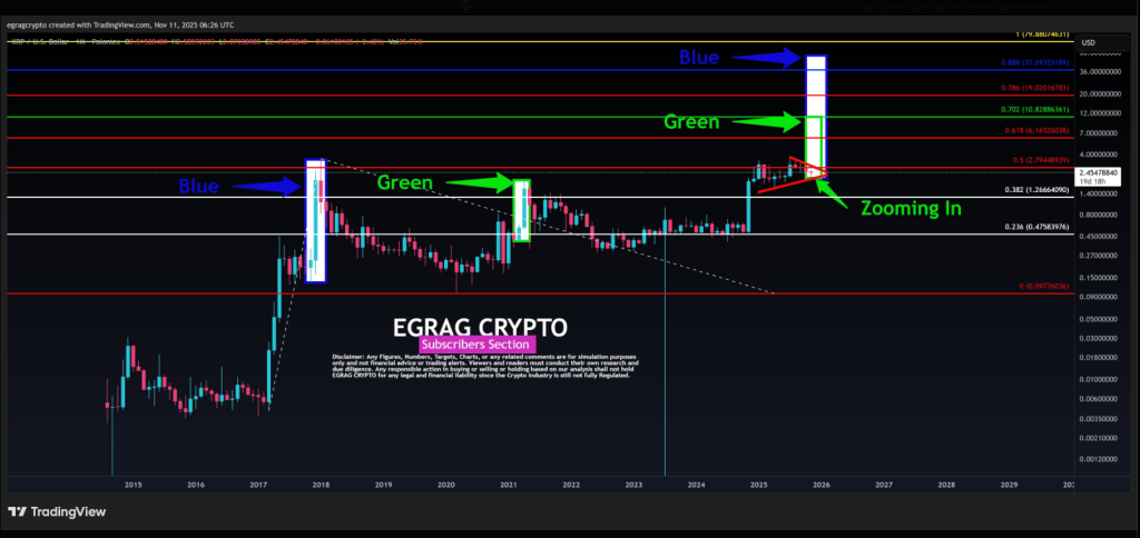 “Mark my words: XRP will usually melt faces within 4–6 weeks, and history backs it up with evidence,” Egrag, who put a target range of $10 to $37 for this cycle, said.