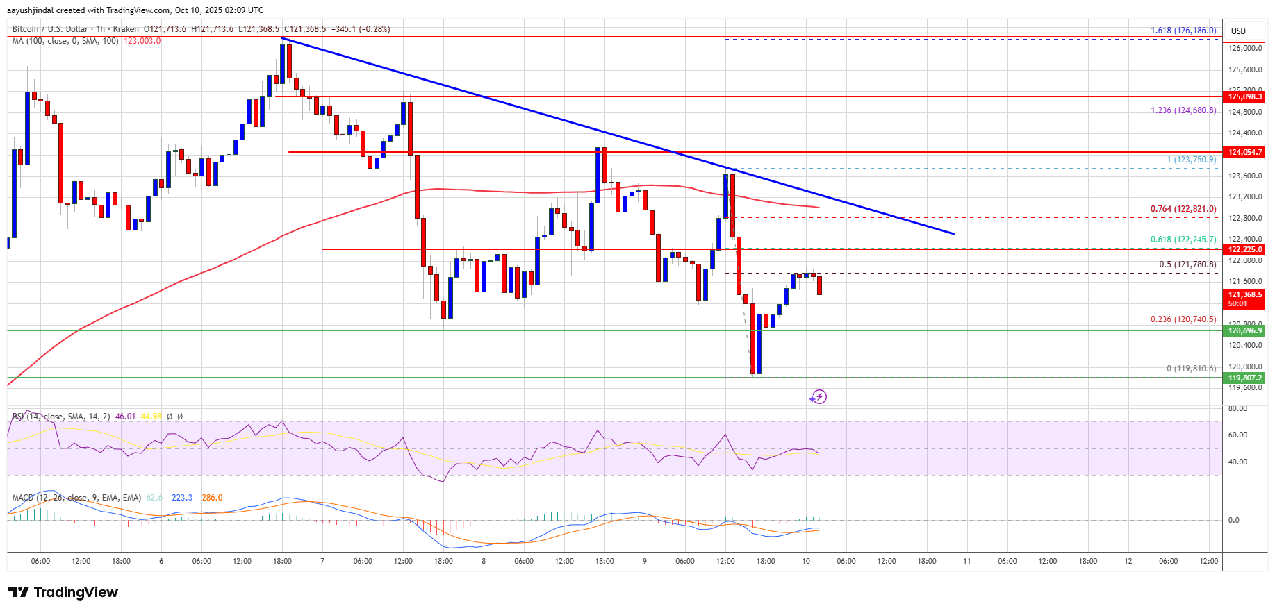 The bears even pushed the price below $121,200. A low was formed at $119,810 and the price recently recovered some losses. There was a move toward the 50% Fib retracement level of the recent decline from the $123,750 swing high to the $119,810 low.
