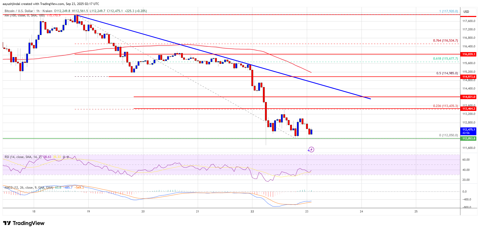 The decline gained pace below the $114,000 level. A low was formed at $112,050 and the price is now consolidating losses below the 23.6% Fib retracement level of the recent decline from the $117,920 swing high to the $112,050 low.