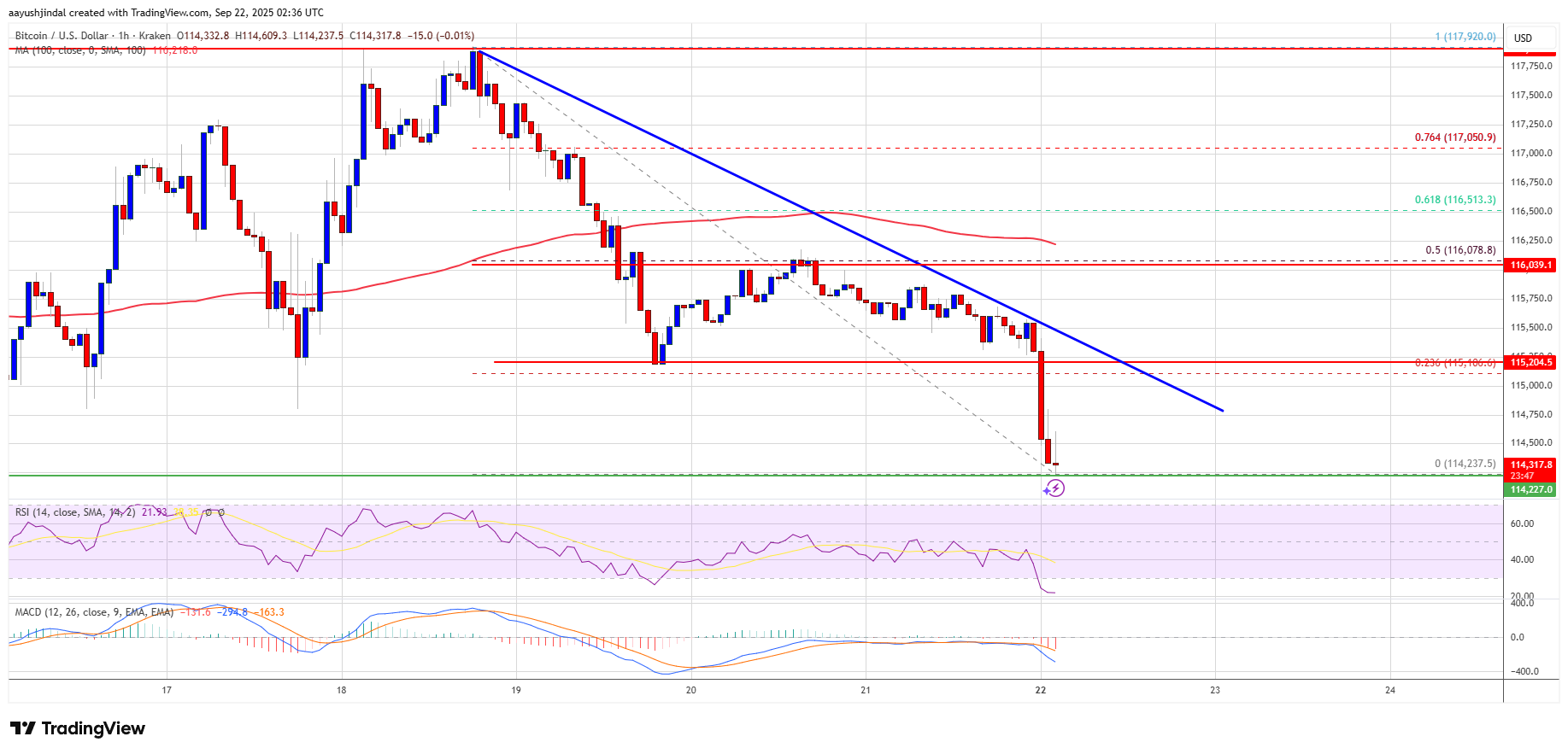 A high was formed at $117,920 and the price started a fresh decline. There was a move below the $116,500 and $115,500 levels. The decline gained pace below the $115,000 level. A low was formed at $114,237 and the price is now consolidating losses below the 23.6% Fib retracement level of the recent decline from the $117,920 swing high to the $114,237 low.