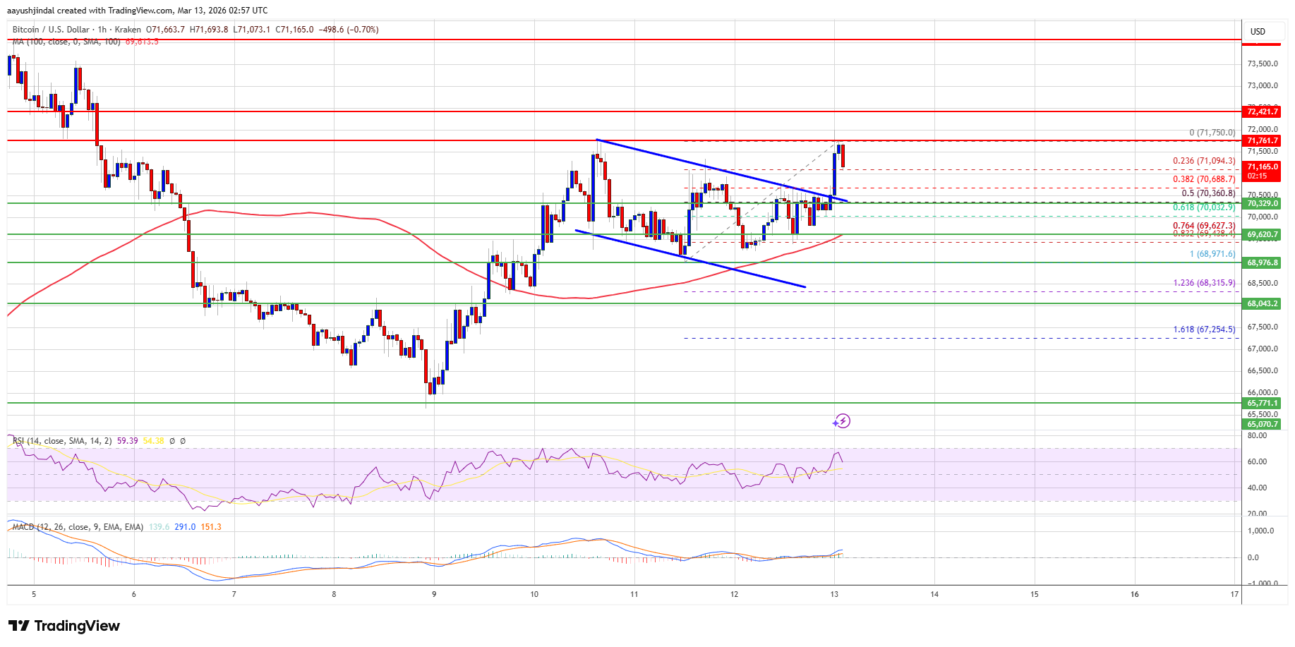 There was a break above a bullish flag with resistance at $70,500 on the hourly chart of the BTC/USD pair. The pair even climbed above the $71,000 level. A high was formed at $71,750, and the pair is now consolidating gains near the 23.6% Fib retracement level of the recent upward move from the $68,971 swing low to the $71,750 high.