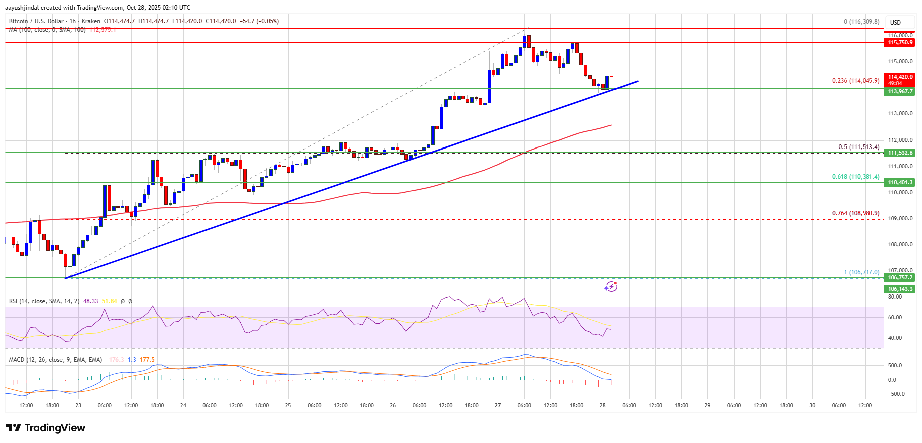Besides, there is a bullish trend line forming with support at $113,900 on the hourly chart of the BTC/USD pair. Bitcoin is now trading above $114,000 and the 100 hourly Simple moving average.