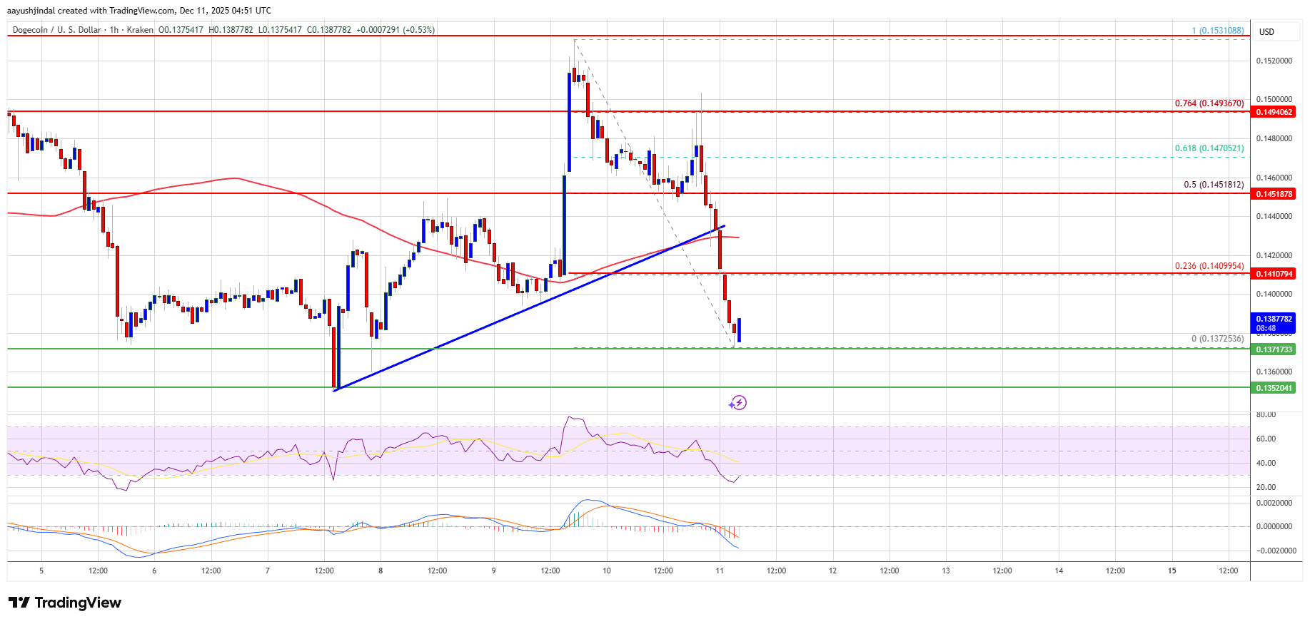 More importantly, there was a break below a key bullish trend line with support at $0.1450 on the hourly chart of the DOGE/USD pair. The price even traded below $0.140. A low was formed near $0.1372, and the price is now showing bearish signs below the 23.6% Fib retracement level of the downward move from the $0.1531 swing high to the $0.1372 low.