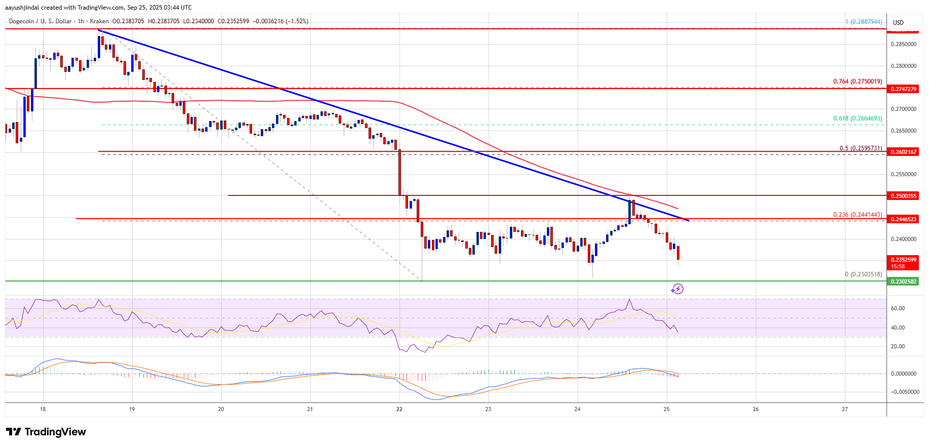 Dogecoin price is now trading below the $0.250 level and the 100-hourly simple moving average. If there is a recovery wave, immediate resistance on the upside is near the $0.2450 level and the trend line. The first major resistance for the bulls could be near the $0.250 level.