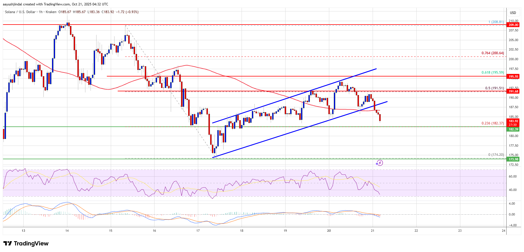 However, the bears remained active below $195. They protected the 61.8% Fib retracement level of the downward move from the $208 swing high to the $174 low. SOL is again moving below $190. Besides, there was a break below a key rising channel with support at $188 on the hourly chart of the SOL/USD pair.