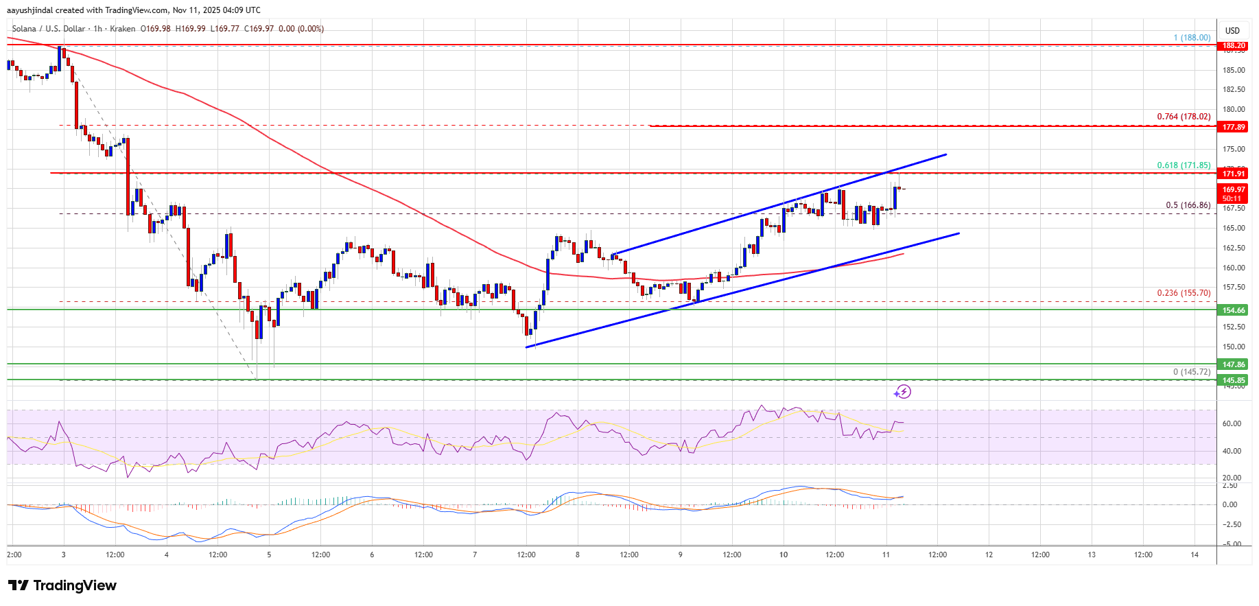 Solana is now trading above $162 and the 100-hourly simple moving average. On the upside, immediate resistance is near the $172 level and the 61.8% Fib retracement level of the downward move from the $188 swing high to the $145 low.
