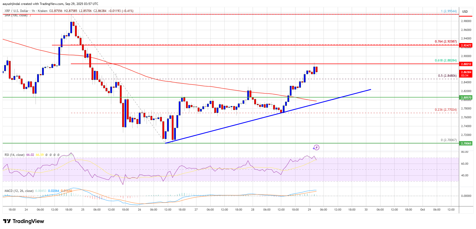 - There is a connecting bullish trend line forming with support at $2.80 on the hourly chart of the XRP/USD pair (data source from Kraken).