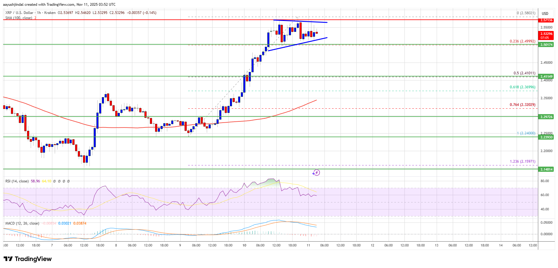 If XRP fails to clear the $2.580 resistance zone, it could start a fresh decline. Initial support on the downside is near the $2.50 level. The next major support is near the $2.420 level or the 50% Fib retracement level of the upward move from the $2.240 swing low to the $2.580 high.