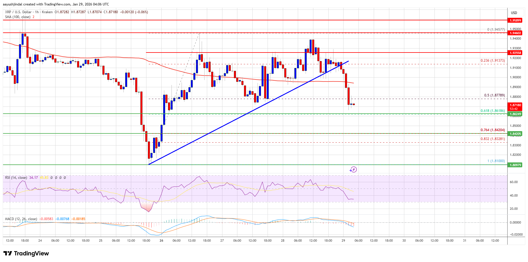 XRP price failed to clear $1.950 and started a downside correction, like Bitcoin and Ethereum. The price dipped below the $1.90 and $1.880 levels to enter a negative zone.