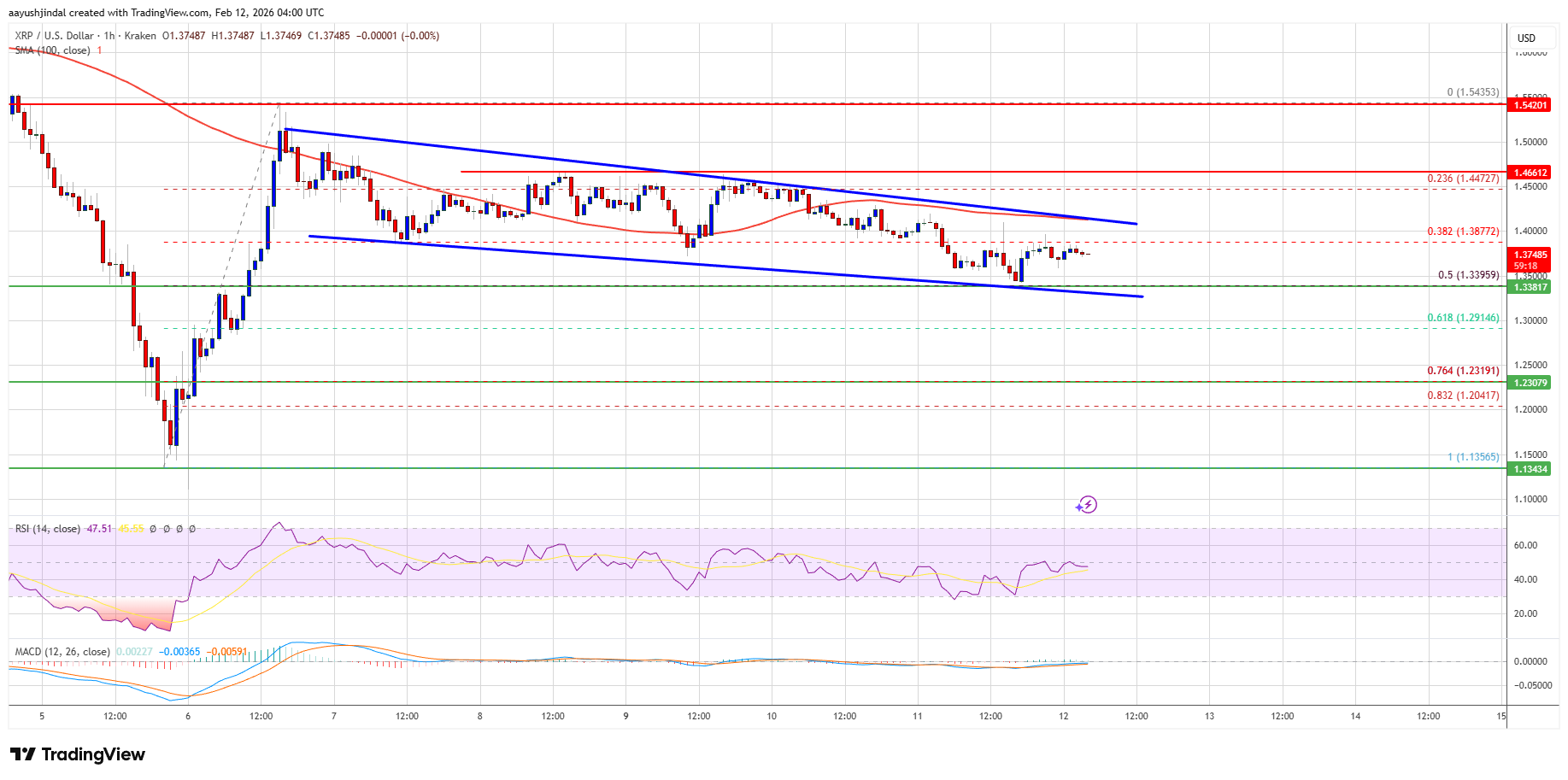 The price even dipped below the 38.2% Fib retracement level of the upward move from the $1.1356 swing low to the $1.5435 high. However, the bulls remained active near the $1.340 zone. Besides, there is a declining channel forming with resistance at $1.4050 on the hourly chart of the XRP/USD pair.