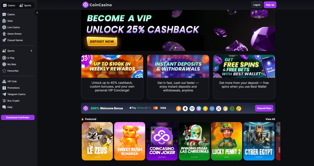 CoinCasino在近年迅速崛起,已累積超過4,000款遊戲作品,由Octoplay、NetEnt、Hacksaw、Pragmatic Play及Big Time Gaming等多家國際供應商提供支持。平台內容多元,包含老虎機、累積獎金機種、二十一點、百家樂、輪盤與各類真人遊戲,分類明確且載入速度快,能滿足從休閒用戶到高額玩家的需求。
