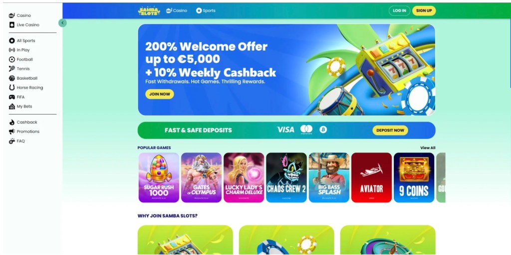 - Sambaslots – 匯集老虎機、真人遊戲與多幣種支付的綜合娛樂場