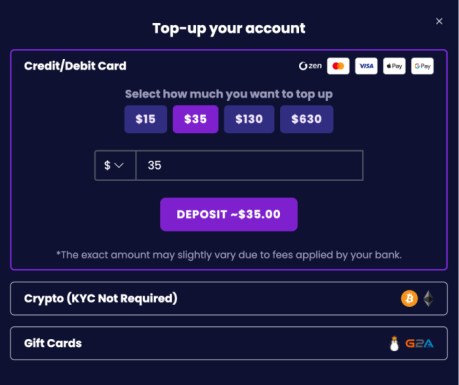 Go to the Top-Up section, select a payment method (credit card, PayPal, or crypto), and enter the amount you want to deposit.