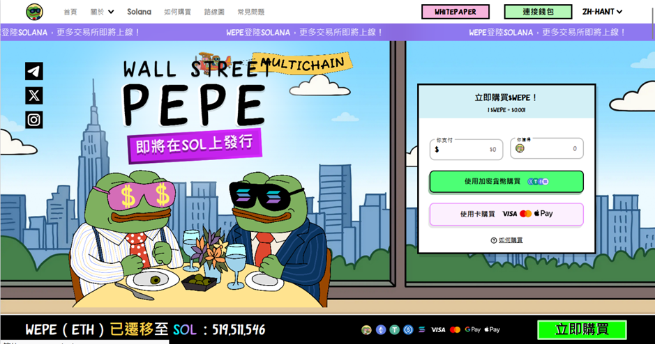 在公開發行之前,Wall Street Pepe先進行了公眾預售,並在短短幾個月內售罄。該次ICO籌得了7300萬美元的加密貨幣投資,成為2025年最成功的預售活動之一。撰稿時,$WEPE在過去三個月已上漲160%。這並非沒有原因,Wall Street Pepe現正擴展到Solana,該鏈是迷因幣活動的主要平台之一。