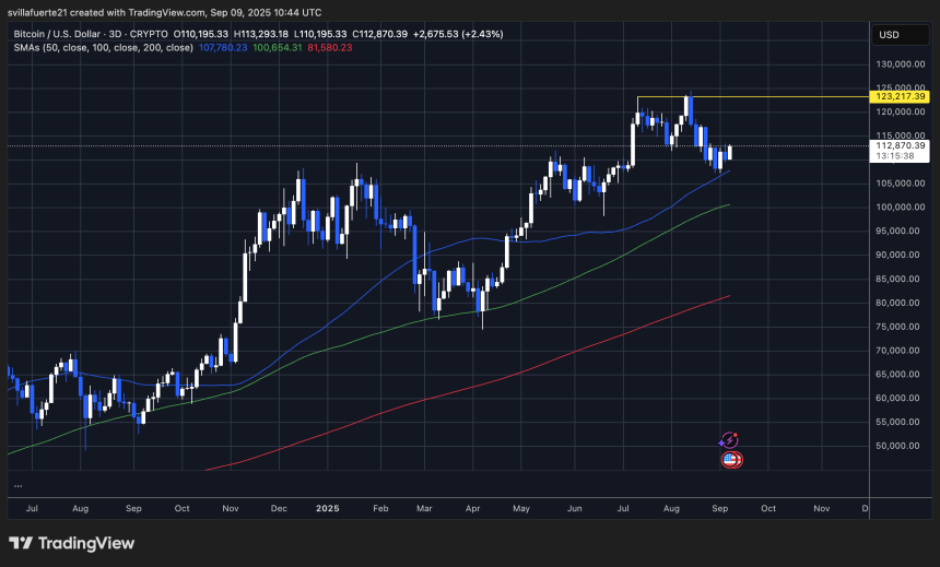 Bitcoin is currently trading around $112,870, staging a modest recovery after a pullback from its all-time high near $124,500. The chart shows that BTC has been in a consolidation phase following months of strong gains, with price action now hovering above the 100-day moving average (green line) and testing the mid-term trend structure.