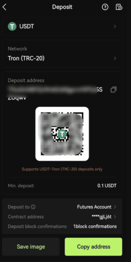 如果您已經擁有加密貨幣,可以透過點擊應用程式首頁的「存款」按鈕將其轉入Bitunix。選擇您想存入的加密貨幣及對應的網路(如適用)。然後使用提供的錢包地址或二維碼,從您的加密錢包轉帳資金。