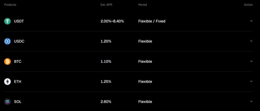 所有代幣均支援靈活質押週期。以USDT為例,用戶可選擇彈性質押,或鎖定7天、14天、30天或60天等固定期限。截至2025年中,USDT質押的年化收益率(APY)區間為2.00%至8.40%,視期限與市場狀況浮動。