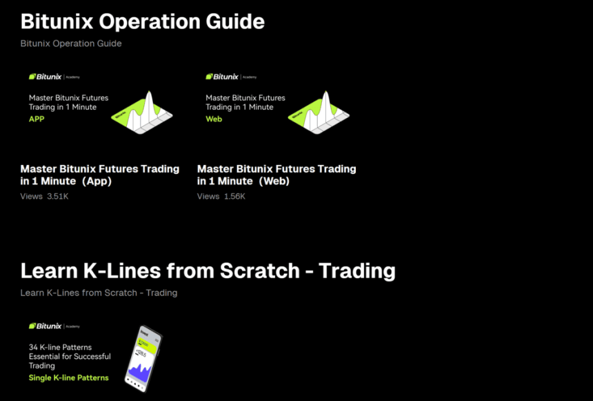 Bitunix學院是該交易所為新交易者和投資者設立的學習中心。雖然指南庫不是特別龐大,但現有的指南內容非常深入。你可以詳細了解Bitunix交易平台和應用程式的使用方法,學習如何使用Coinglass進行期貨合約交易,掌握保證金交易,並深入研究K線圖形態。