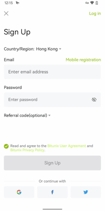 造訪Bitunix官網並點選註冊。選擇使用信箱、手機或第三方帳號註冊。 Bitunix支援使用Google、Apple、Facebook和X帳號註冊。