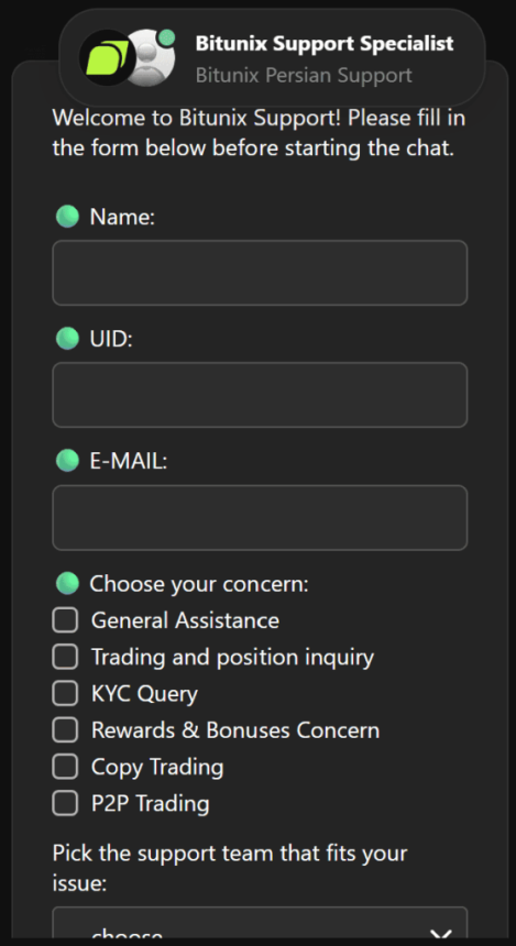 您可以透過線上聊天或線上要求表單與Bitunix的客服團隊聯繫。透過線上聊天連接到客服只需幾秒鐘。請求表格支援文件上傳,如果您有更複雜的問題,這可能是個不錯的選擇。