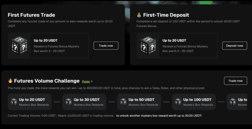 - 首次期貨交易:首次完成期貨訂單,可解鎖最高20 USDT的期貨獎金神秘盒。