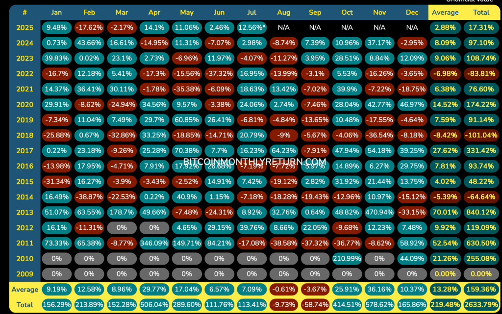 Ein Blick in die historischen Monatsrenditen von Bitcoin zeigt, im Juli geht es im Durchschnitt um rund 7 % nach oben. In diesem Jahr liegt die Performance bereits bei über 12 %, was ein überdurchschnittlicher Start ins dritte Quartal ist. Statistisch folgt darauf zwar häufig ein schwächerer August oder eine Konsolidierung im September. Aber ob das 2025 ebenfalls gilt, bleibt offen. Schließlich schreibt Donald Trump aktuell seine eigene Krypto-Agenda.