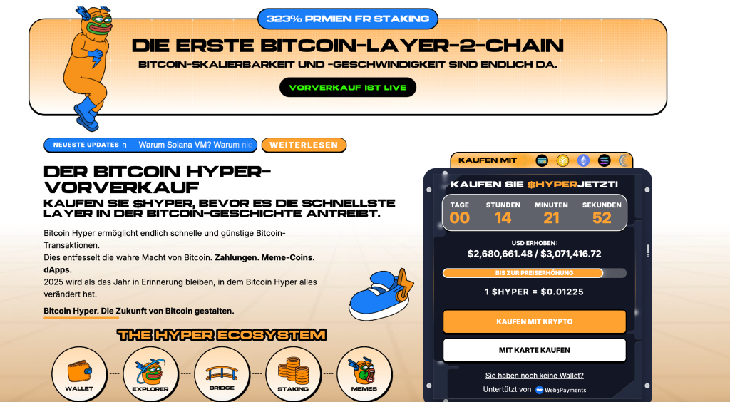 Während sich Bitcoin auf neue Höhen schwingt, suchen viele Anleger nach Coins mit noch größerem Gewinnpotenzial und genau hier kommt Bitcoin Hyper ins Spiel. Das Projekt will das DeFi-Potenzial, das Ethereum groß gemacht hat, nun erstmals auf Bitcoin übertragen. Möglich wird das durch eine Layer-2-Lösung auf Solana-Basis, mit der Bitcoin-Inhaber zukünftig Zugang zu Staking, Lending und günstigen Transaktionen erhalten. Dabei könnte es sich um eine Revolution für den Bitcoin-Sektor handeln.