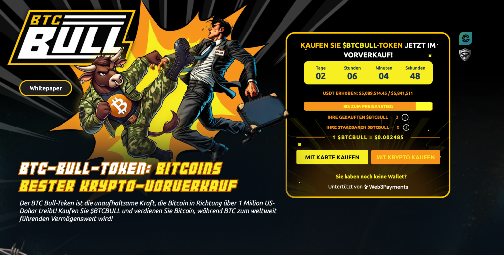 Aktuell befindet sich $BTCBULL noch im Presale. Anleger können also zum vergünstigten Startpreis einsteigen, wobei der Preis in mehreren Stufen bereits während des Vorverkaufs angehoben wird. Da bereits über 5 Millionen Dollar im Presale umgesetzt wurden, erwarten viele Analysten, dass $BTCBULL nach dem offiziellen Listing an den Börsen erheblich steigen könnte, wobei auch ein Anstieg um mehr als 1.000 % nicht ausgeschlossen wird. Vor allem, wenn Bitcoin seine Rallye wie erwartet fortsetzt, könnte $BTCBULL durch die Decke gehen.