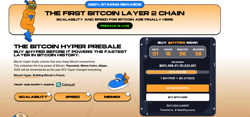 Noch befindet sich $HYPER im Vorverkauf. Das heißt, Anleger können den Token zum günstigen Fixpreis kaufen, bevor der Börsenstart erfolgt. Die Nachfrage ist bereits enorm. Über 800.000 Dollar wurden innerhalb weniger Tage investiert. Der Tokenpreis steigt alle zwei Tage, sodass frühe Investoren bereits jetzt im Plus sind und bis zum Handelsstart an den Börsen schon einen hohen Buchgewinn mitnehmen können.