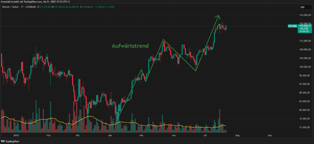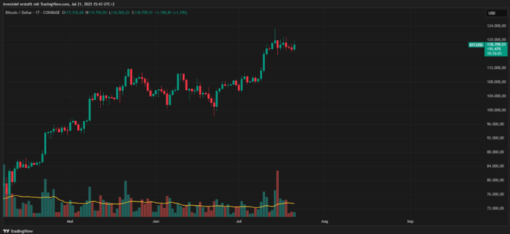 (Nach dem Allzeithoch bei 123.091,61 US-Dollar ist der Bitcoin-Kurs in eine Konsolidierung gelaufen – Quelle: Tradingview.com)