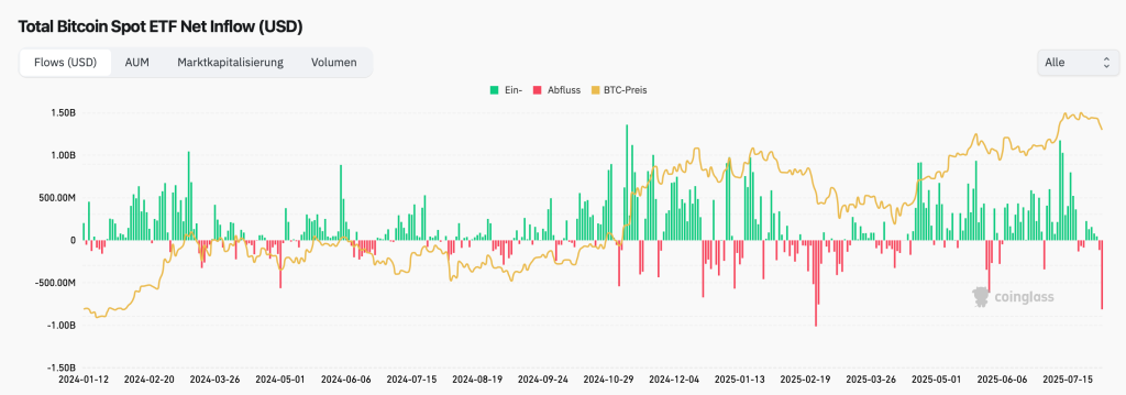 In der vergangenen Woche wurden laut Coinglass 643 Millionen Dollar aus Bitcoin‑ETFs abgezogen, das Ende einer siebenwöchigen Zuflussserie. Im Gegensatz dazu verzeichnet Ethereum erneut Kapitalzuflüsse. Ob der Trend noch diese Woche kippt, bleibt abzuwarten, doch die Dynamik hat eindeutig nachgelassen.