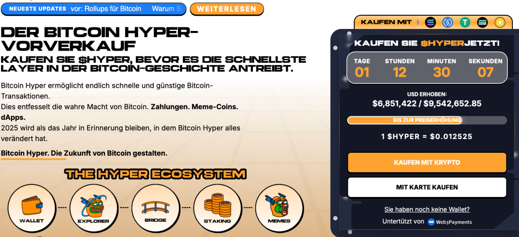 Der native Token $HYPER befindet sich aktuell im Vorverkauf, wobei in kurzer Zeit bereits über 6,8 Millionen Dollar investiert wurden. Analysten sehen in Bitcoin Hyper das Potenzial, zu einem der größten Coins dieses Marktzyklus zu werden, mit einem möglichen Kursanstieg von tausenden Prozent nach dem Börsenlisting. Wer früh einsteigt, könnte demnach deutlich profitieren, sobald sich die neue Chain in der Praxis bewährt.