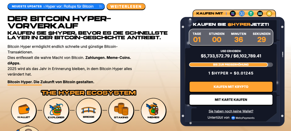 Möglich wird das, indem Anleger ihre Coins auf die neue Blockchain bridgen und dort nutzen. Der technologische Sprung macht Bitcoin Hyper zu einem der spannendsten Projekte des Jahres. Derzeit ist der native Token $HYPER noch im Vorverkauf erhältlich und schon jetzt haben Anleger über 5,7 Millionen Dollar investiert.