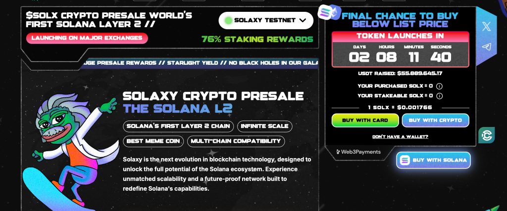 Im Zentrum der neuen Layer 2 steht der native Token $SOLX, der aktuell noch im Vorverkauf erhältlich ist und schon jetzt alle Rekorde bricht. Noch vor dem Börsenlisting haben Anleger über 55 Millionen Dollar investiert, um von Anfang an dabei zu sein. Damit stehen die Chancen gut, dass Solaxy schnell zu einem Milliarden Dollar Projekt aufsteigt, was für frühe Investoren Renditen von weit mehr als 1.000 % bedeuten würde. Allerdings endet der Vorverkauf schon in 2 Tagen.