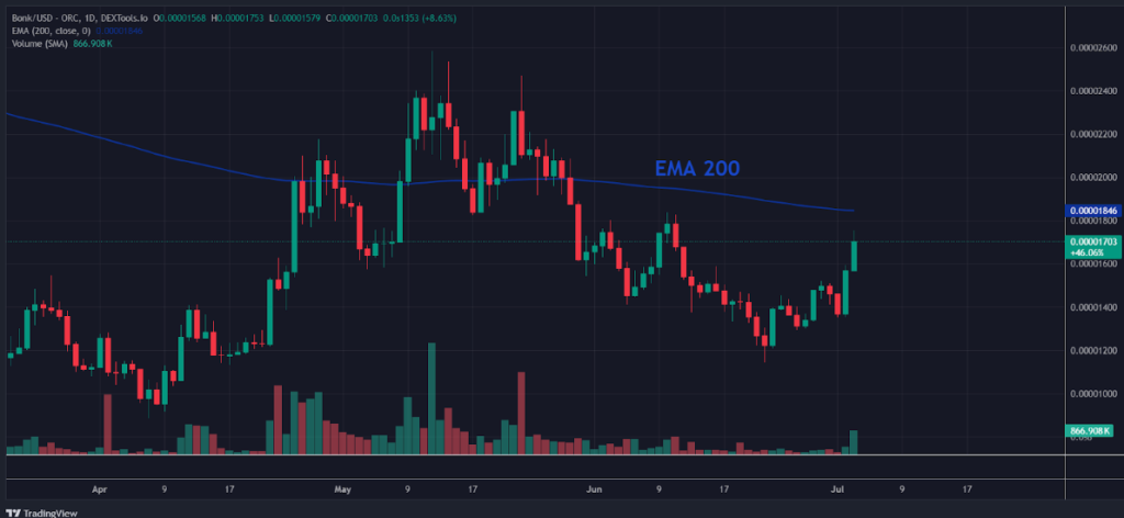 ($BONK ist in den letzten Tagen unter hohem Volumen angestiegen und notiert jetzt knapp unter dem EMA 200 – Quelle: Tradingview.com)