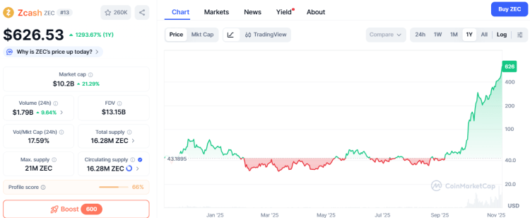 In diesem Zeitraum hat Zcash seinen Wert um das 18-fache gesteigert und raste von $34,59 auf mittlerweile $614,22. Diese Kursexplosion ist umso beeindruckender, als sie in einem Umfeld stattfindet, das von tiefster Depression geprägt ist.